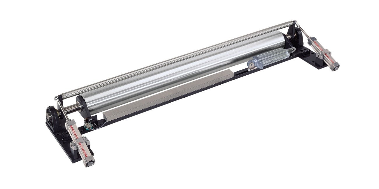 回转推进辊系统 ELPLACER 通过调节辊的轴向运动来定位运行幅面。当调节辊到达端部位置时,材料从装置上升起,调节辊在中心位置居中,幅面再次降下。由于回转推进辊专用于循环运行的生产线,因此在停止时间内会始终升起幅面。